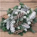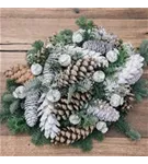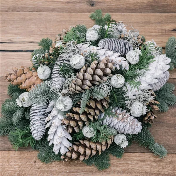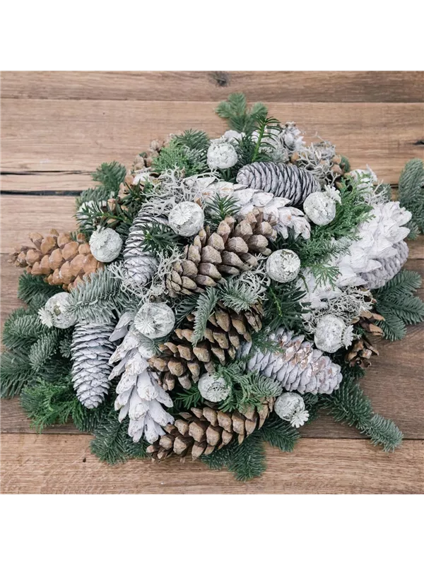 Mit Zapfen gestecktes Arrangement mit Trockenmaterialien , sehr haltbar und geeignet für die kalte Jahreszeit. Die Abbildung zeigt die Variante für 35€.