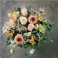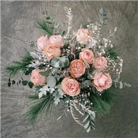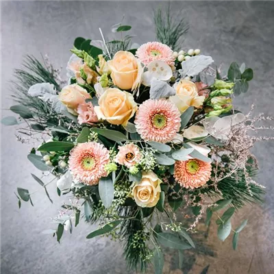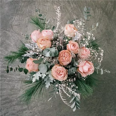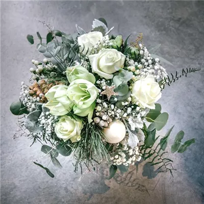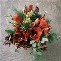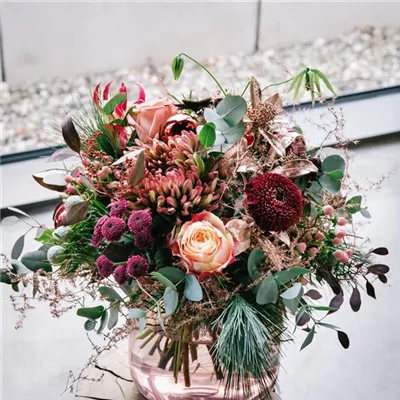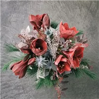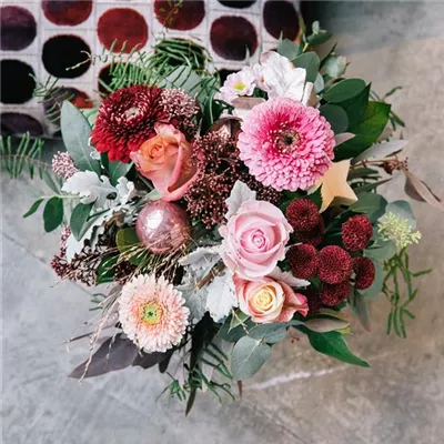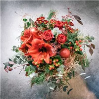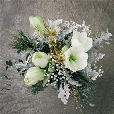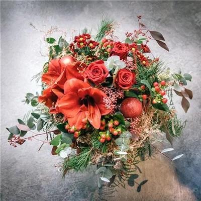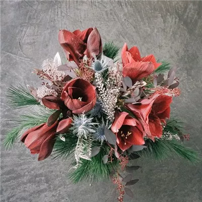 Weihnachtlich gebundener Strauß in Rosè mit Amaryllis.