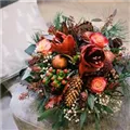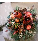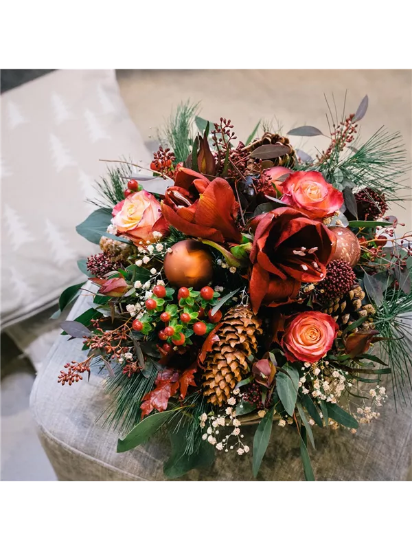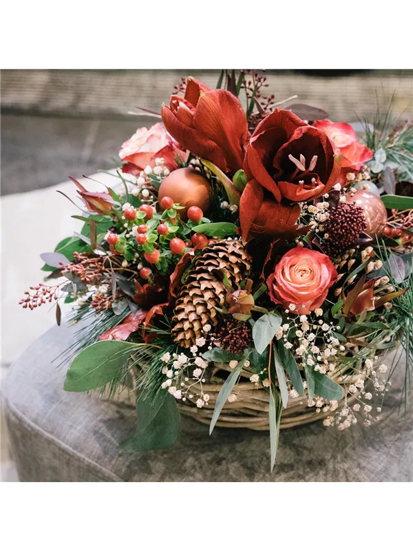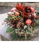Liebevoll gesteckter Korb in rot mit Amaryllis, Kugeln, Zapfen etc. gerade zur Adventszeit ein echter Hingucker.
