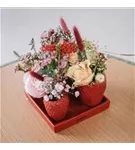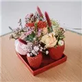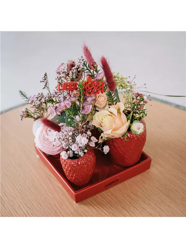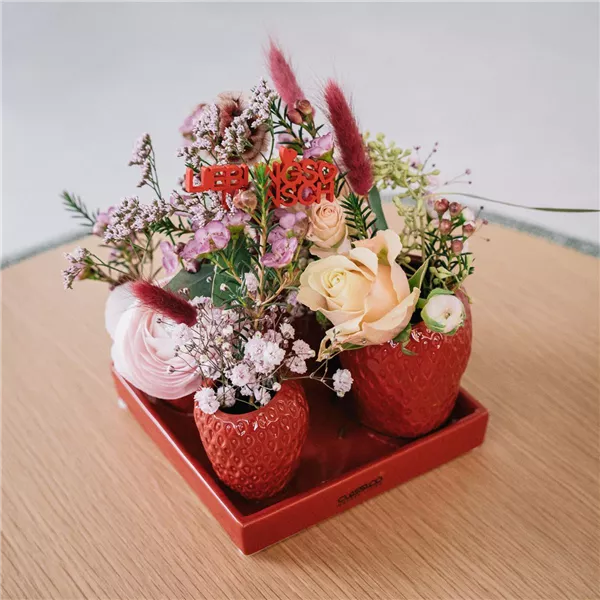 Blumiges Arrangement mit Rosen in einem roten Keramikteller mit 4 festen Keramik Erdbeeren darauf versehen, inkl. Lieblingsmensch Stecker.