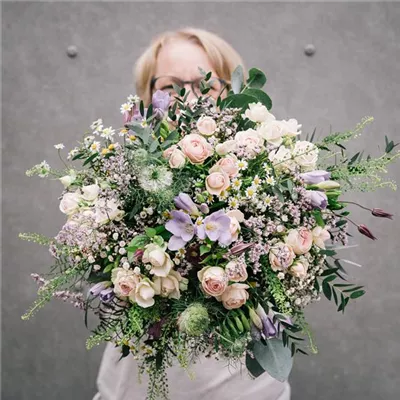 Eine frische Kombination aus Ranunkeln, Tulpen und weiteren Frühlingsblühern in frischen Pastell-bunten Farben. Die Abbildung zeigt die Variante für 34,95€.