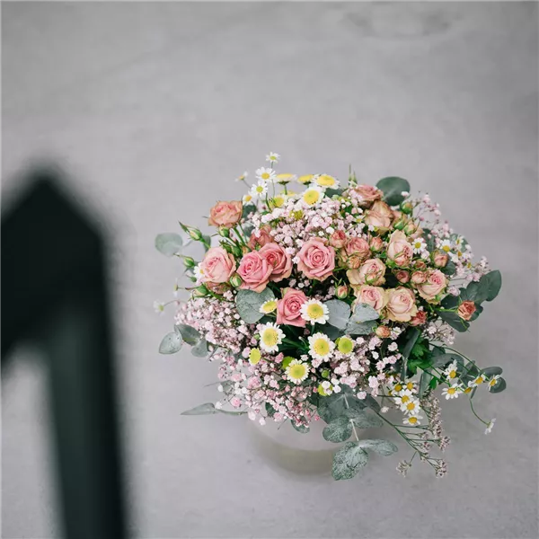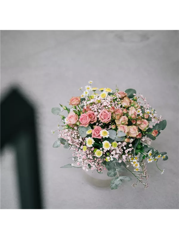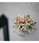 Eine frische Kombination aus Rosen, Kamille und weiteren schönen Blühern in frischen Pastell-bunten Farben. Die Abbildung zeigt die Variante für 44,95€.