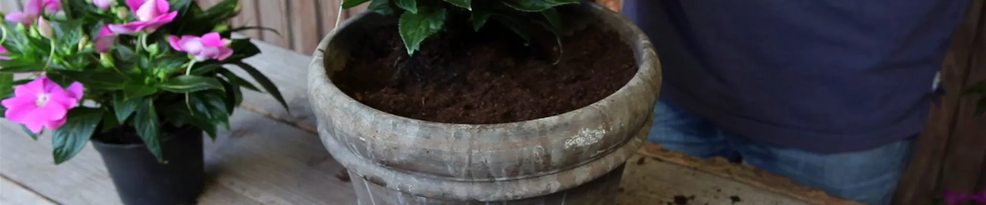 Bevor Sie handelsübliche Blumenerde in den Topf füllen, sollten Sie das Loch aber leicht bedecken: Zum Beispiel mit einer Tonscherbe. Diese verhindert, dass das Abzugsloch verstopft.
