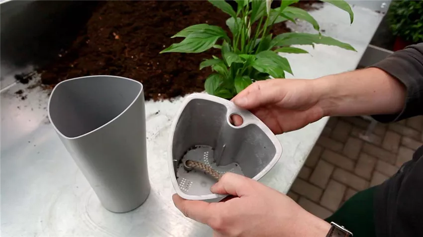 Solche wasserspeichernden Blumentöpfe werden im Handel in den unterschiedlichen Ausführungen angeboten. Bei manchen wird das Wasser über Stoffbänder oder Dochte nach oben in das Pflanzsubstrat geleitet.