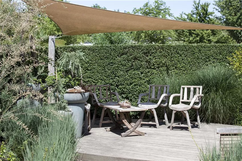 Fürs Wohlbefinden ist am Sitzplatz etwas "Rückendeckung" notwendig, denn der Mensch hat das Bedürfnis sich geschützt zu fühlen. Wählen Sie für Ihren Sitzplatz deshalb einen Strauch, eine Hecke, eine Mauer oder ein begrüntes Rankelement als Abgrenzung oder als Hintergrund. Gegebenenfalls ist ein weiterer Sichtschutz notwendig. Ganz flexibel sind Sie mit Paravents oder gespannten Stoffbahnen, die gerade bei einem mobilen Sitzplatz vor unerwünschten Blicken schützen.
