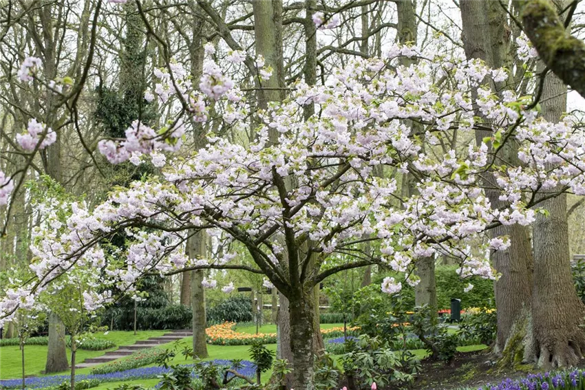 Die Zwergzierkirsche ( Prunus serrulata ) kommt aus der Familie der Rosengewächse. Je nach Wetterverhältnissen blüht sie drei bis vier Wochen lang. Sie wächst sehr kompakt und wird bis zu 1,50 m groß. Besonders hübsch sind ihre leicht gedrehten Ästchen. Nach der Blüte sollte sie zurückgeschnitten werden, damit sie in der nächsten Saison wieder in voller Schönheit bewundert werden kann.